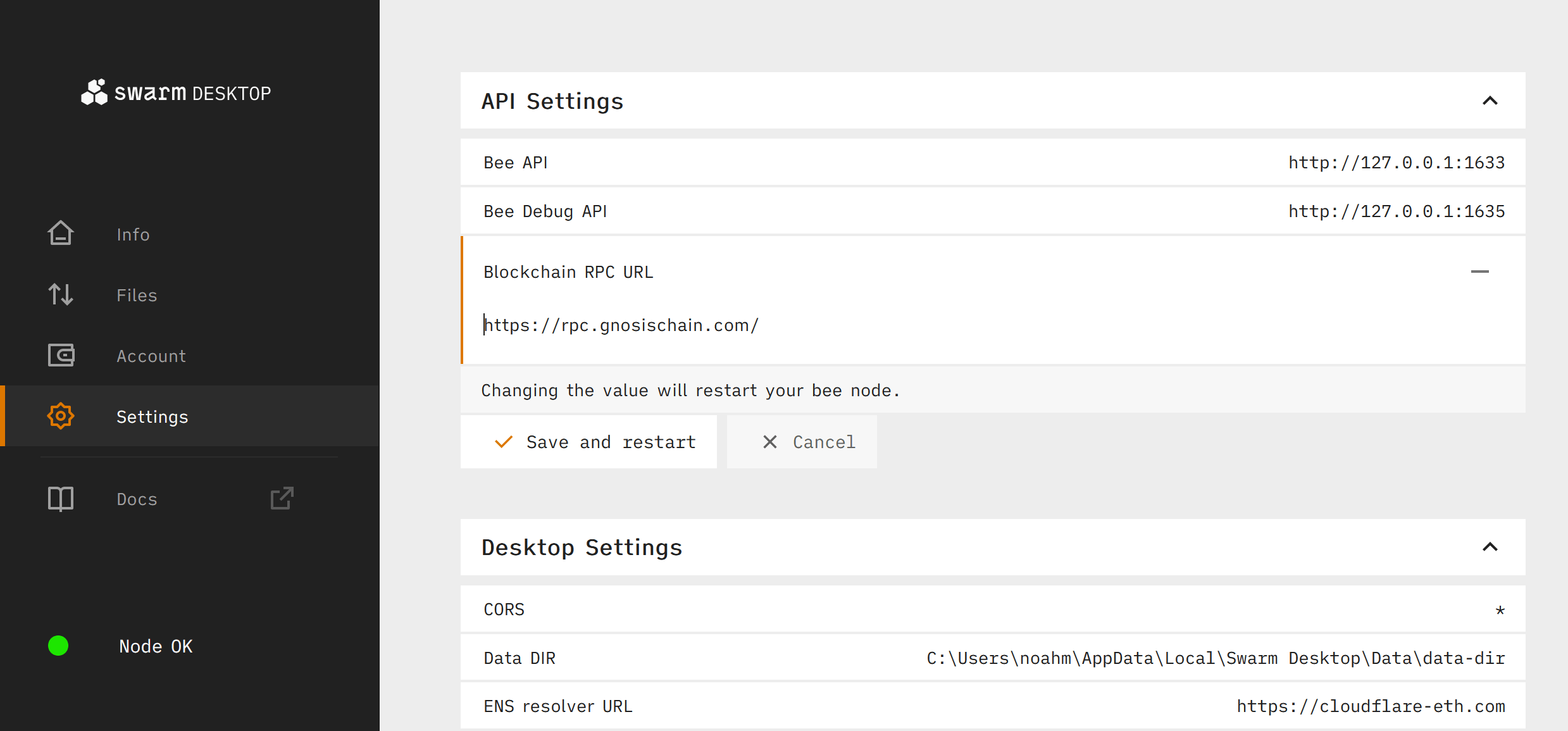 From the Settings tab, expand the API Settings section and click the pen button next to Blockchain RPC URL to edit the default RPC. You can choose any valid Gnosis Chain RPC, either from your own Gnosis node or a service provider. You can find a list of paid and free RPC options from the Gnosis Chain docs. For this example we will use the free endpoint - https://xdai.fairdatasociety.org.